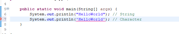 "HelloWorld "은 문자열로 인식이 되지만 ' ' 를 사용하면 사진처럼 빨간밑줄이 생기고 에러가 생긴다.